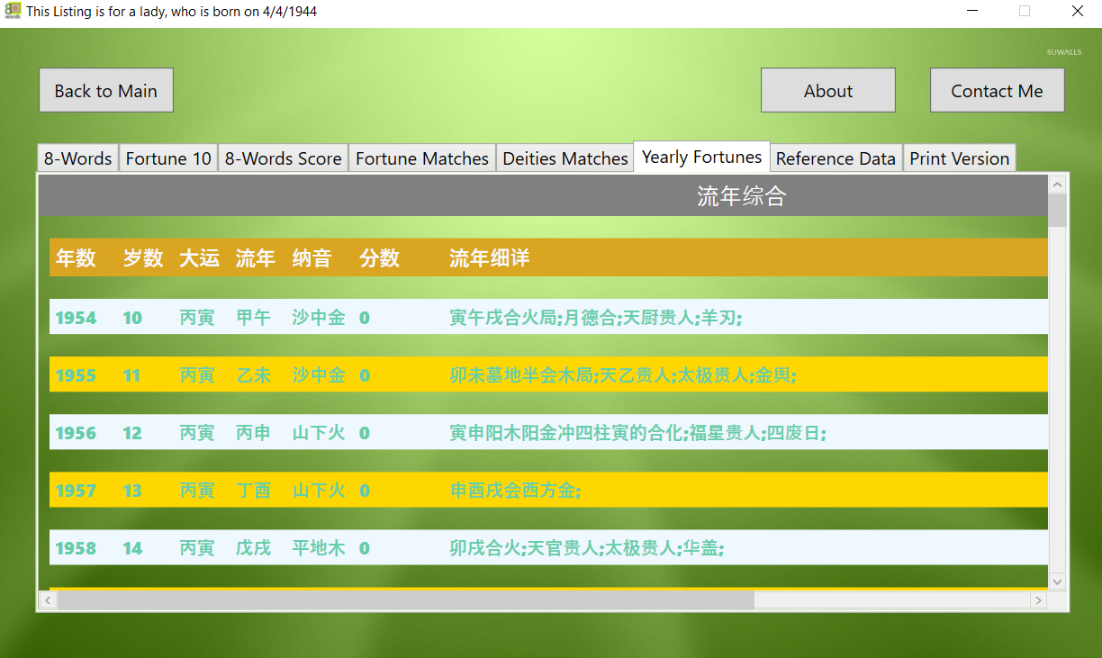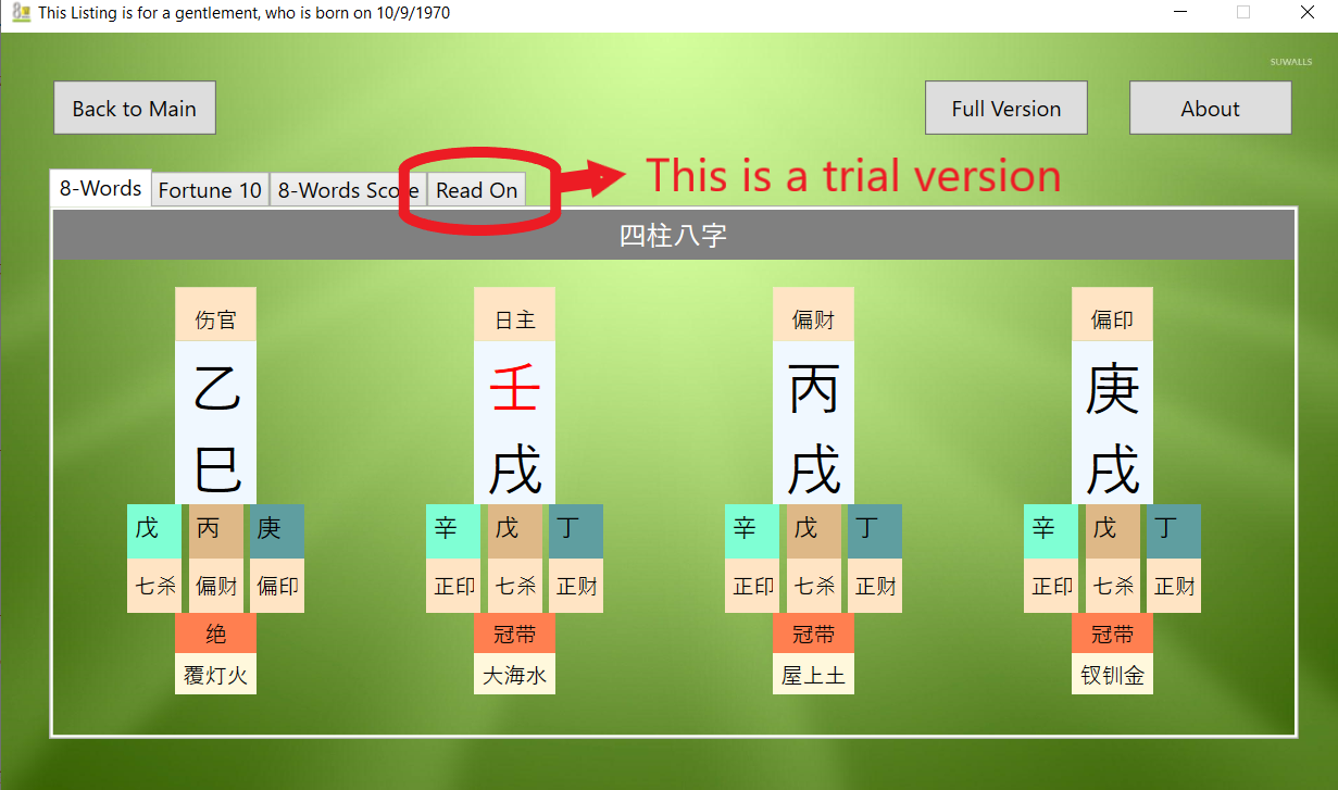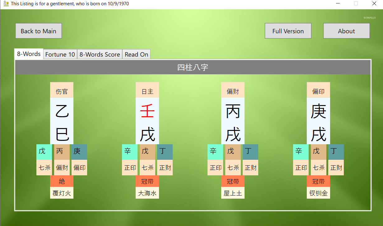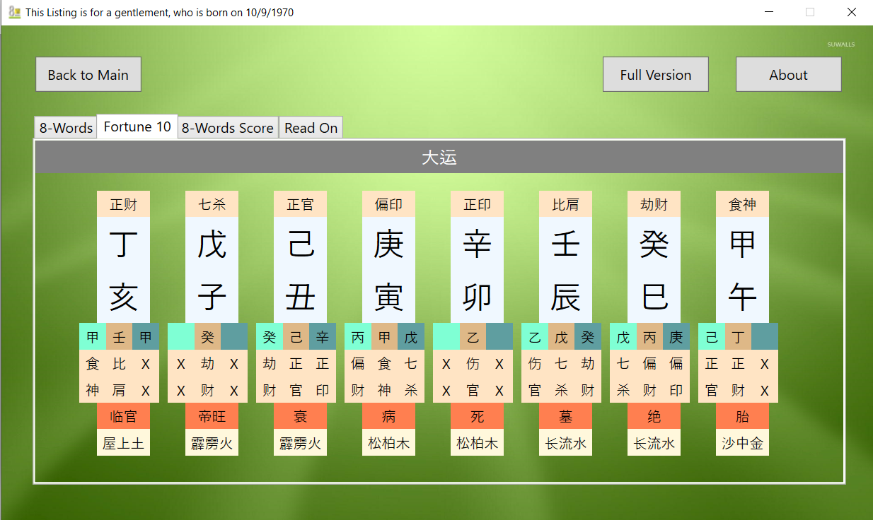 It also come with fortune-decades that also includes NaYin, Ten-God, Twelve-Gong and Branh-Hidden Stem.