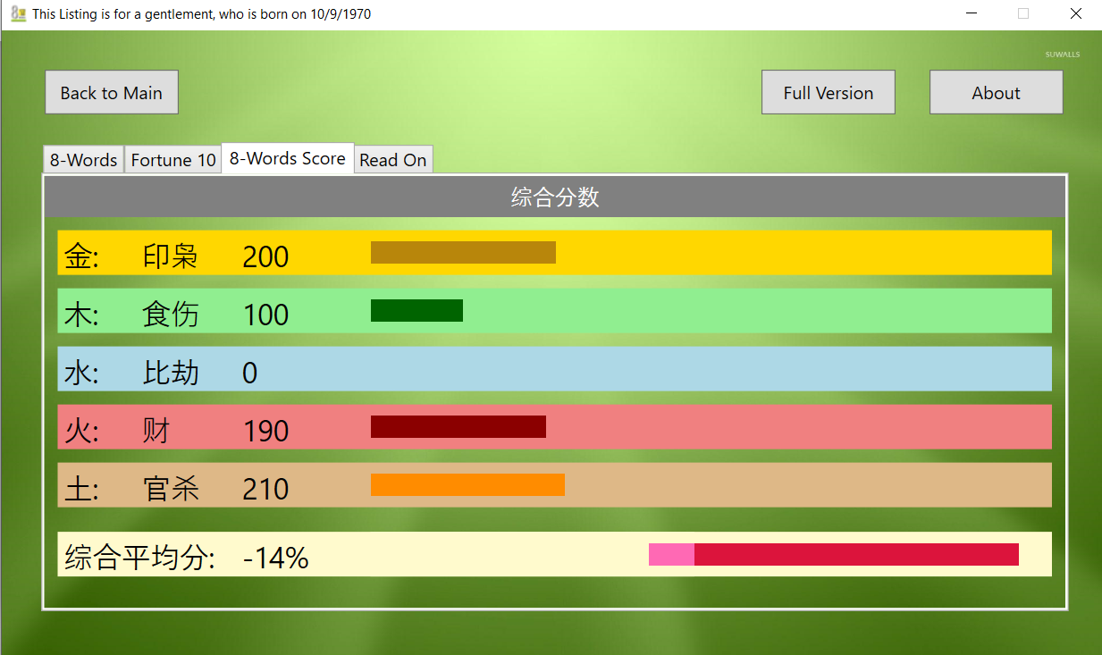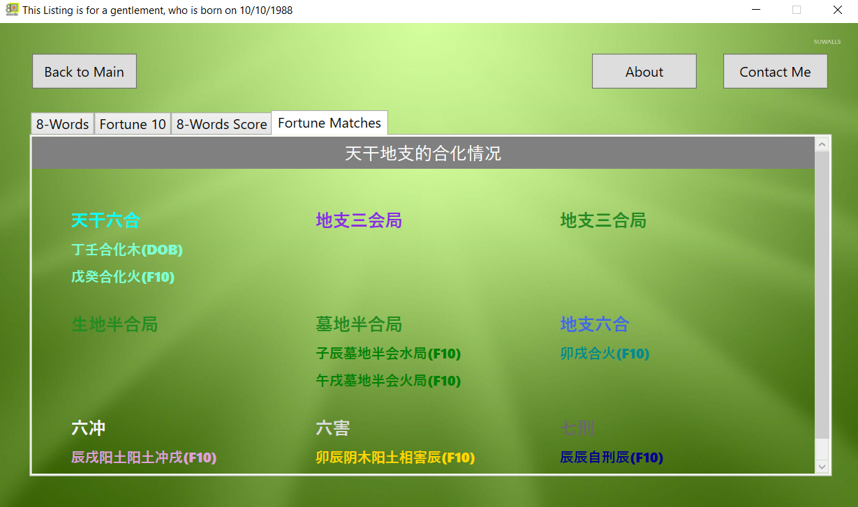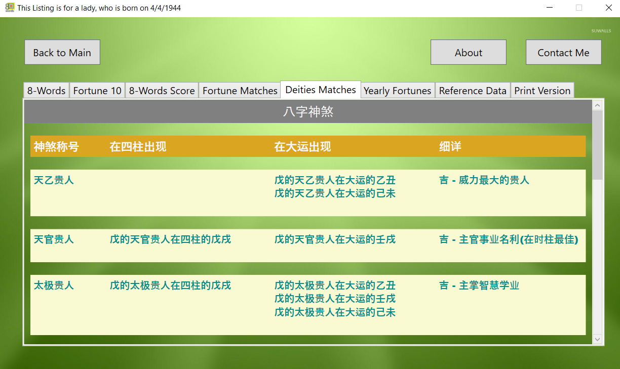 It also come with fortune-decades that also includes NaYin, Ten-God, Twelve-Gong and Branh-Hidden Stem.